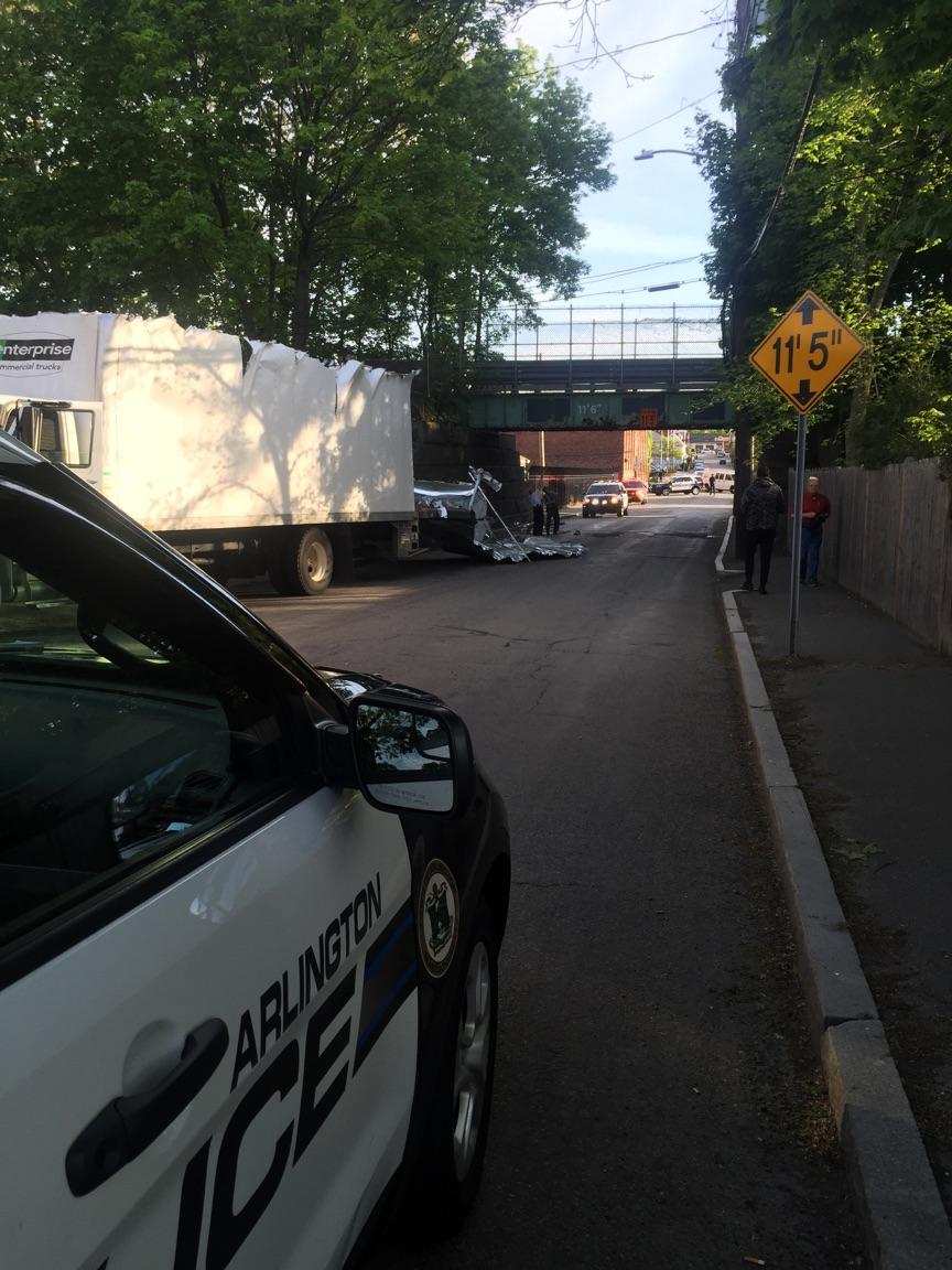 Arlington Police responded to Grove Street at approximately 6:15 p.m. and, upon arriving, observed a rental truck stopped with a large debris field behind it. There were no injuries.