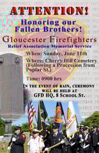 In the event of rain, the service will be held at Gloucester Fire Headquarters at 8 School St.