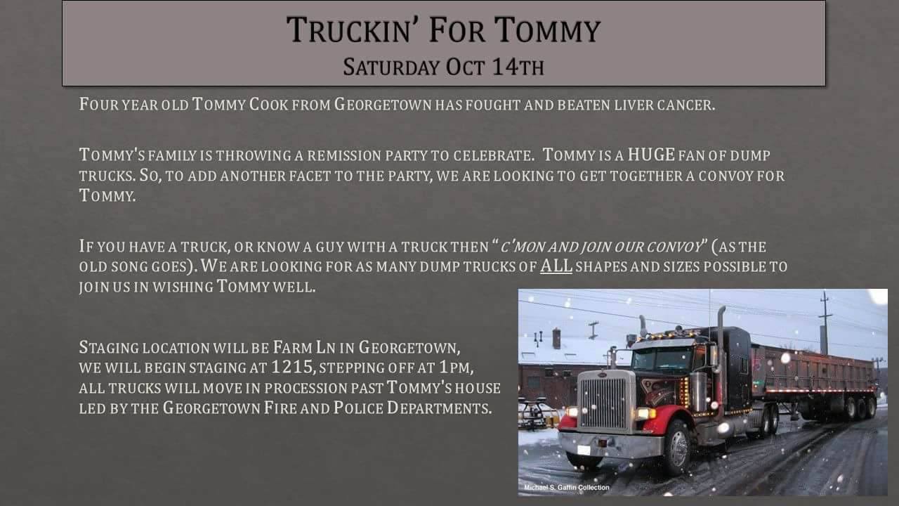 Tommy’s family is throwing a party for their son following a positive prognosis that his liver cancer has gone into remission. He is a remarkably big fan of trucks of all kinds, so the Georgetown Fire and Police Departments will lead the convoy featuring a variety of work trucks and other vehicles.