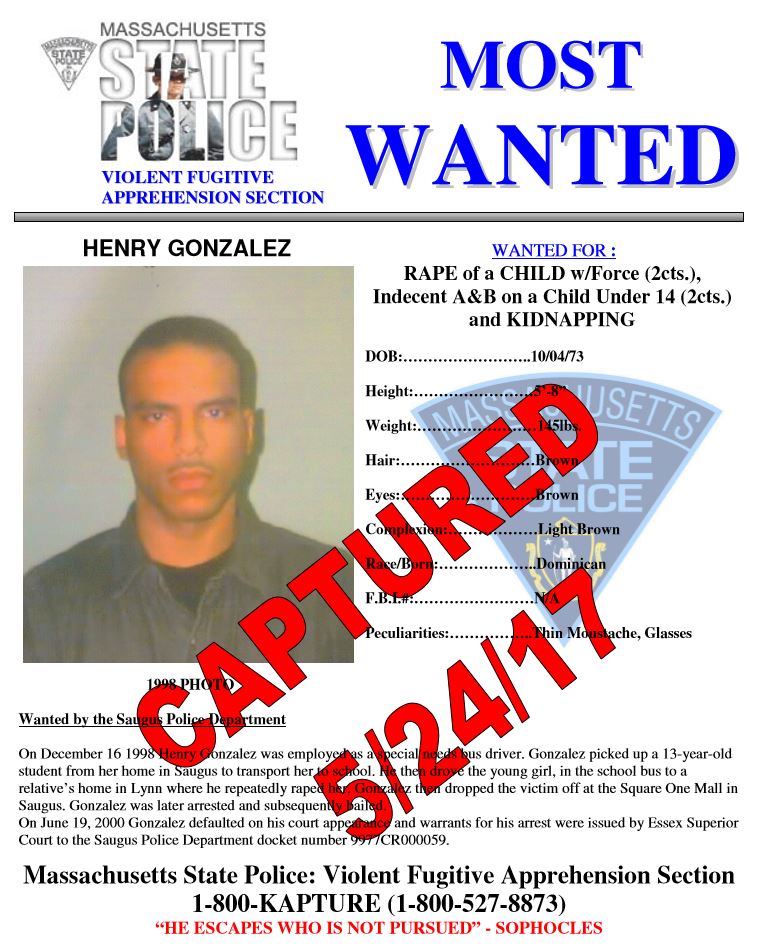 “Today, I want to commend the Essex County District Attorney’s Office, the investigators with the Massachusetts State Police, the Saugus Police Department, and the deputies of the United States Marshals Service for their steadfast commitment to ensuring Henry Gonzalez be held accountable for the crimes for which he has been sought since 2000,” said John Gibbons, United States Marshal for the District of Massachusetts. “I hope this arrest brings some measure of closure to the victim and affected family members who have waited 17 years for justice in this case.”