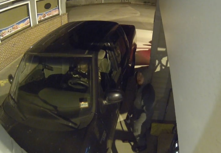 The second vehicle appears to be a mid-2000s Chevy TrailBlazer with New Hampshire plates, which was operated by a white male who was wearing a gray hoodie. The white man is seen approaching the driver’s side of the F-150, near the attendant’s kiosk. He then looks in the glass door of the structure and attempts to break in. When he realizes there is a camera, the suspect hits it to displace its view.