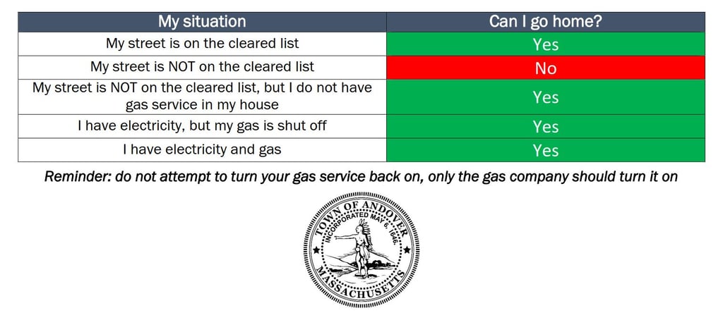 ANDOVER — Town Manager Andrew P. Flanagan, Police Chief Patrick Keefe and Fire Chief Michael B. Mansfield report that the Town of Andover expects residents will be able to return to their homes early tomorrow morning.