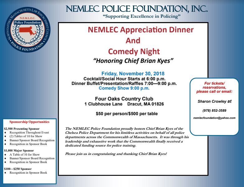 DRACUT — The Northeastern Massachusetts Law Enforcement Council (NEMLEC) Police Foundation, Inc. is pleased to announce its annual Appreciation Dinner and Comedy Night.