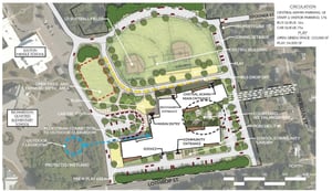 A design plan for the new school calls for a two-story building with pre-K and kindergarten classrooms on the first floor separated by different wings, and first and second grade classrooms on the second floor.