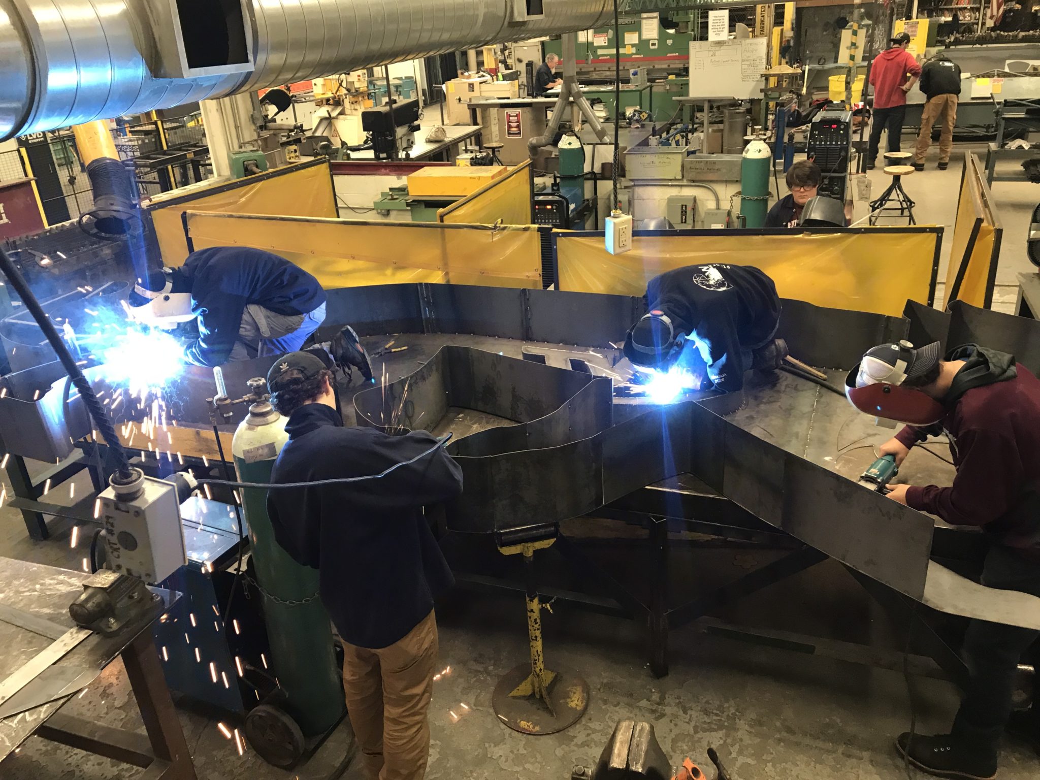 Dubbed “Mega Kitty,” the cat’s design was completed in Autocad and its blueprints were fed into a Vicon plasma cutter that created the metal pieces used to put it together. Students used a power shear to cut the edges and formed the metal in rollers and a brake machine. The pieces of metal were then tacked together with welding tacks, and a skeleton framework was built inside the cat to keep it from buckling.