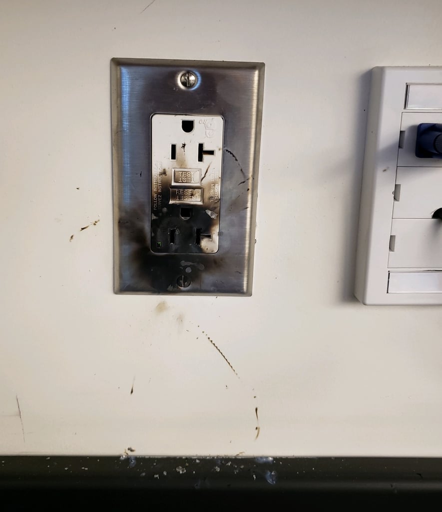 Additionally, an electrical outlet in the back corner of the room was scorched.