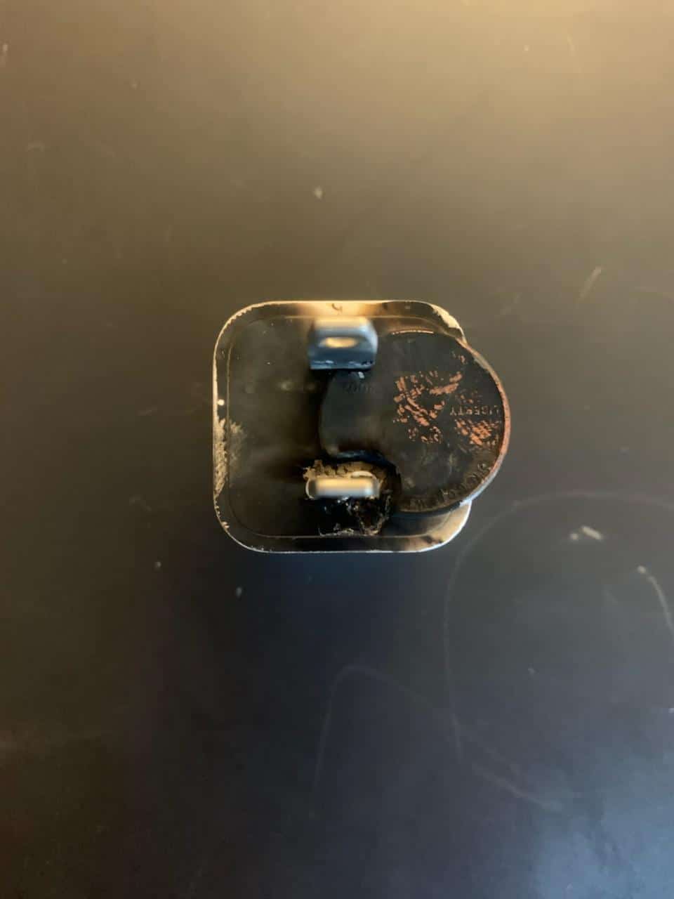 Once at the school, firefighters were directed to a classroom where they located the pronged part of an iPhone charger that had been blackened and scorched. A penny was fused to the prongs of the charger.