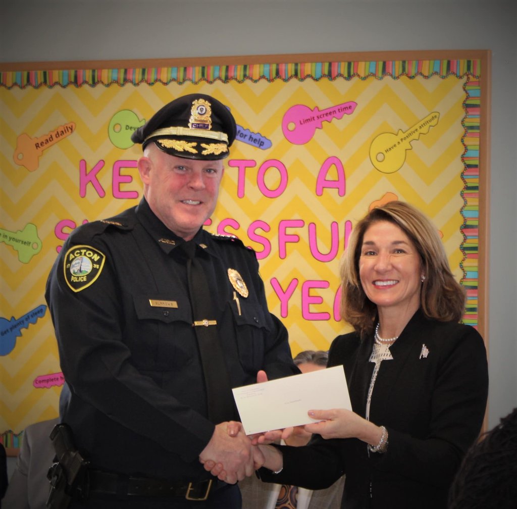 Lt. Gov. Karyn Polito, who chairs the Community Compact Cabinet, presented the grant to Police Chief Richard Burrows at a ceremony yesterday.in Springfield. Acton was one of 51 communities that recieved a total of $3 million in grants to support a broad range of information technology programs.