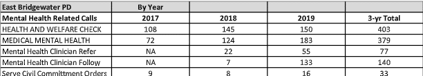 The East Bridgewater Police Department has implemented several initiatives to improve its mental health relations, including the establishment of a sustainable relationship through a Massachusetts Department of Mental Health Jail Diversion Grant with the High Point Treatment Center, the creation and implementation of a model policy to address officers’ interactions with those affected by mental illness and mental health awareness and crisis intervention training for all full-time staff. The Bridgewater Police Department is the lead agency on the five town multi-jurisdictional mental health grant.