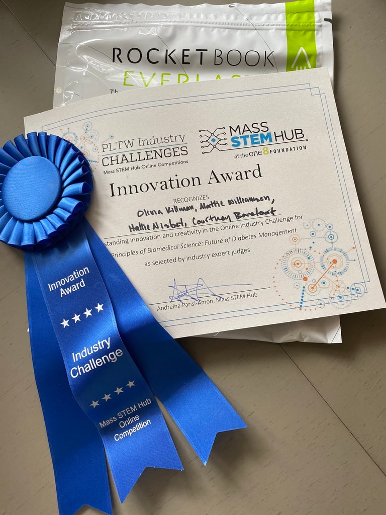 Medway’s Principles of Biomedical Science class participated in the Mass STEM Hub Industry Challenge for Principles of Biomedical Science and competed against students from across the state. The projects were done as part of the class curriculum and students worked on it as teams during class time for about a week and a half in December.