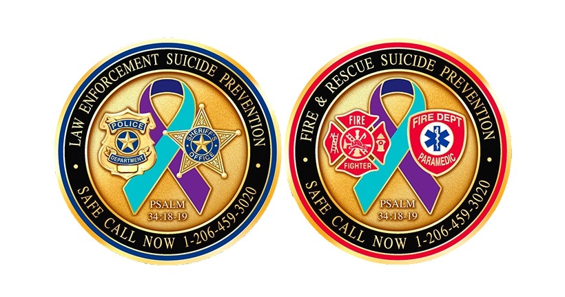 The challenge coins, also called “life coins” because of their purpose to promote mental health, are firefighter themed on one side and police themed on the other, and are engraved with the phone number for Safe Call Now, a confidential, 24/7 suicide prevention hotline dedicated for first responders.