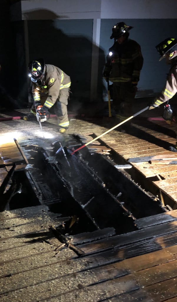 At approximately 12:49 a.m., Acton firefighters responded to a 911 call for a deck fire at 10 Assabet Crossing. Acton Car 30 with shift commander Captain Anita Arnum, Ladder 28, Engine 21, Engine 23, and Rescue 34 responded to the residence. The two-and-a-half-story wood frame home had a rear multi-level deck. The fire was located on the lower level deck where there was a free standing metal fire pit in the center. Firefighters were able to extinguish the fire and prevent it from spreading to the rest of the home.