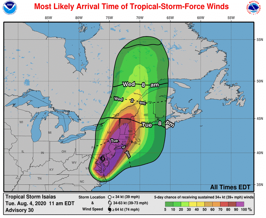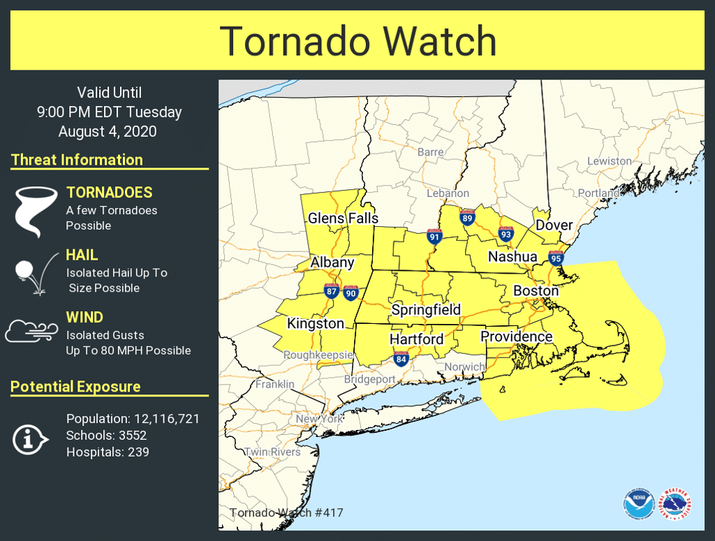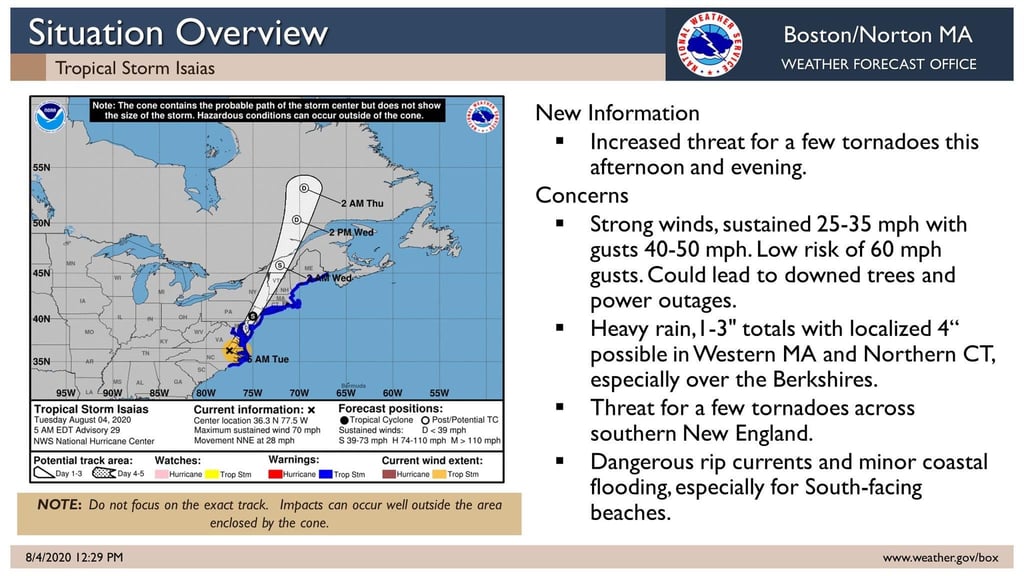 Isaias is expected to arrive to Massachusetts in the late afternoon and continue into tonight. A tropical storm warning is currently in effect for Essex County. A tornado watch has also been issued by the National Weather Service until 9 p.m. tonight. The peak wind forecast is 25-35 mph with gusts up to 45 mph. There is a limited chance of heavy rain, flooding and storm surge, and there is potential for a few tornadoes. Showers and thunderstorms may occur and widespread power outages are possible.