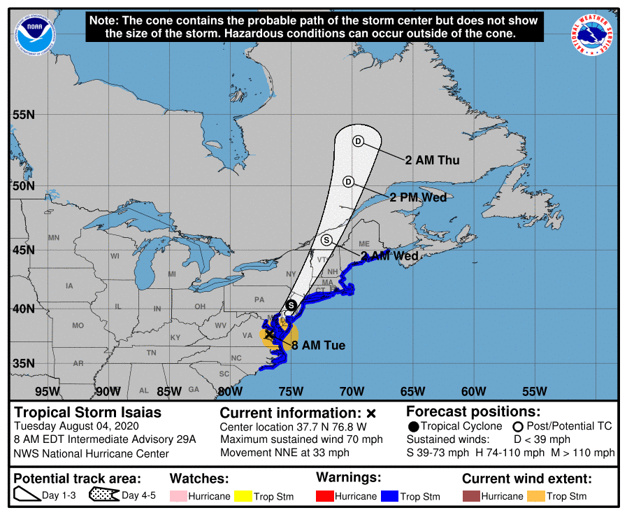 BROOKLINE, MA – As Tropical Storm Isaias continues to move up the coast, with the chance that it may impact New England today, Town Administrator Mel Kleckner recommends that residents take the necessary safety precautions to prepare themselves for a potentially serious storm.