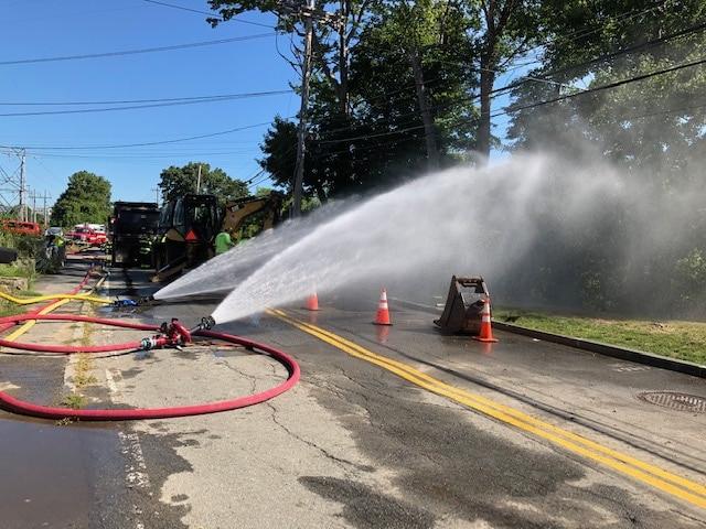 Wakefield firefighters continued to direct water over the excavation site and monitor the nearby homes for natural gas while members of the Wakefield Municipal Gas and Light Department (WMGLD) responded and worked to stop the leak.