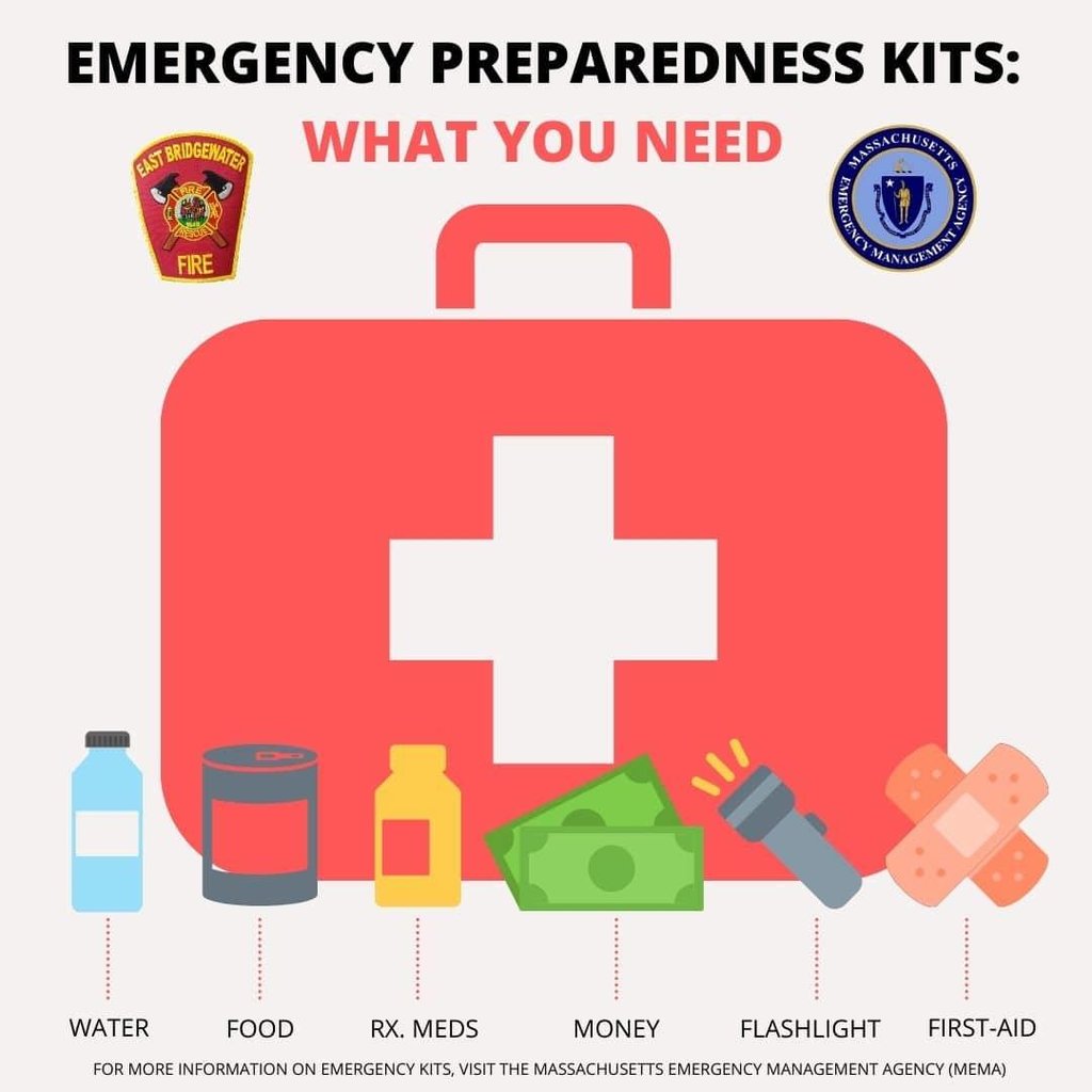 • Also, as a part of Emergency Preparedness Month the East Bridgewater Fire Department encourages families to build an emergency kit. MEMA recommends that emergency kits include essential items that will provide your family members with basic necessities for up to three days in an emergency event.