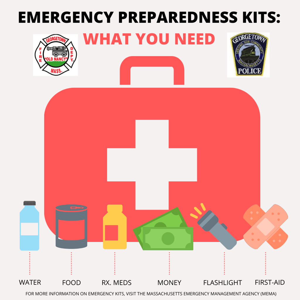 - Also, as a part of Emergency Preparedness Month the Georgetown Fire and Police Departments encourage families to build an emergency kit. MEMA recommends that emergency kits include essential items that will provide your family members with basic necessities for up to three days in an emergency event.