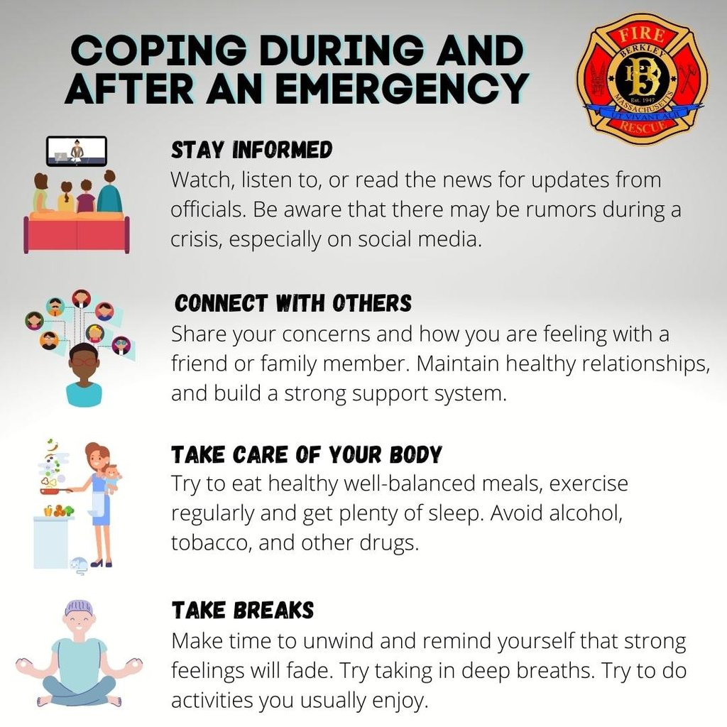 “These are trying times for all of us, and so often we overlook the importance of monitoring our mental and emotional health and well-being,” Chief Fournier said. “That is why it is more important than ever for Berkley residents to familiarize themselves with the following tips for how best to cope during and following an emergency or crisis.”