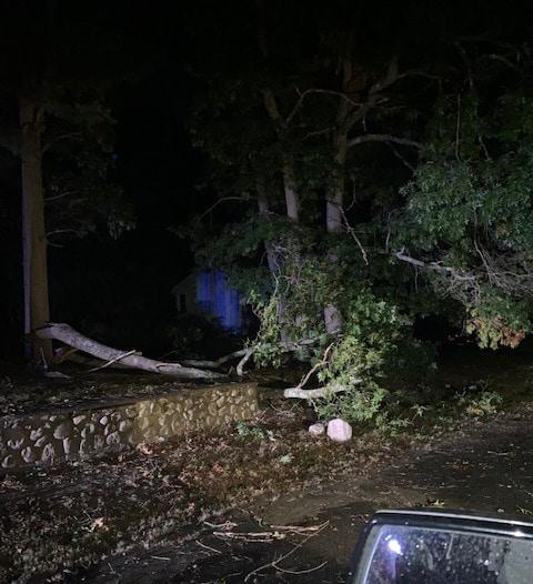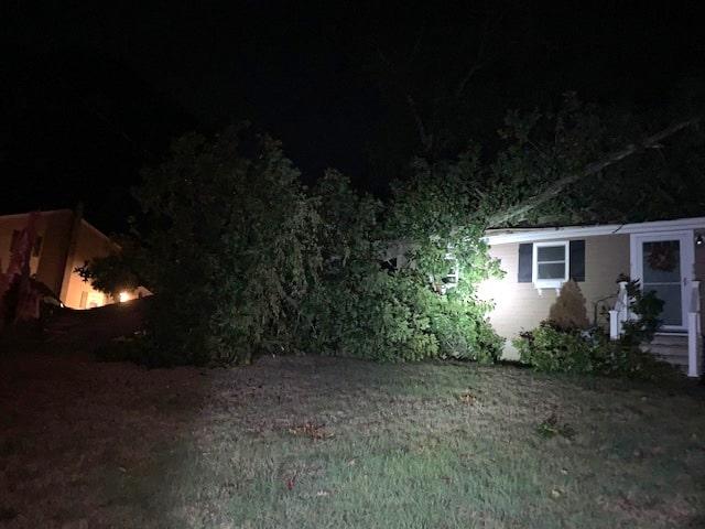 A line of strong thunderstorms passed across Massachusetts Wednesday evening, with wind gusts of up to 60-70 miles per hour according to the Massachusetts Emergency Management Agency. Results of the storm in Whitman included downed trees that had fallen onto homes and downed power lines blocking roadways.