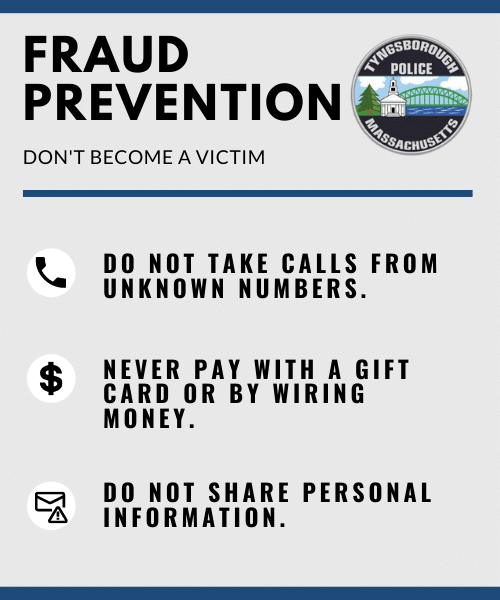 If anyone has any questions or feels that they have been victimized, they are encouraged to call the Tyngsborough Police Department.