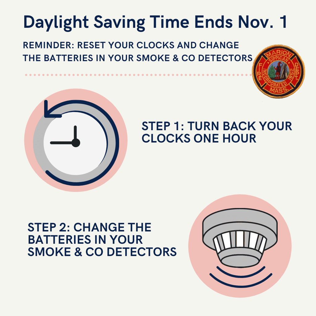MARION — Chief Brian Jackvony and the Marion Fire Department encourage residents to test their smoke and carbon monoxide detectors when setting their clocks back for daylight saving time, and are offering free 9-volt batteries to residents this season.