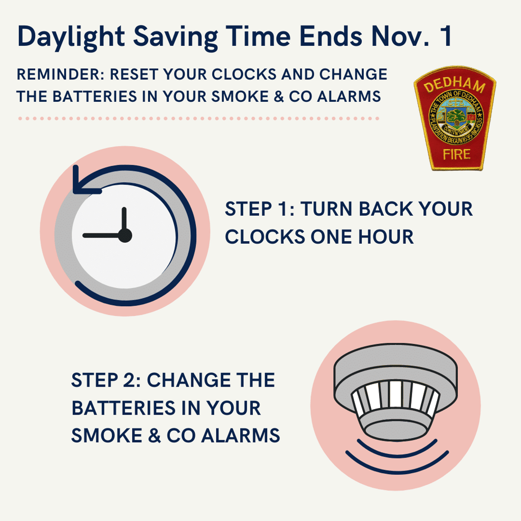 DEDHAM — Chief William Spillane and the Dedham Fire Department encourage residents to test their smoke and carbon monoxide alarms when setting their clocks back for daylight saving time.