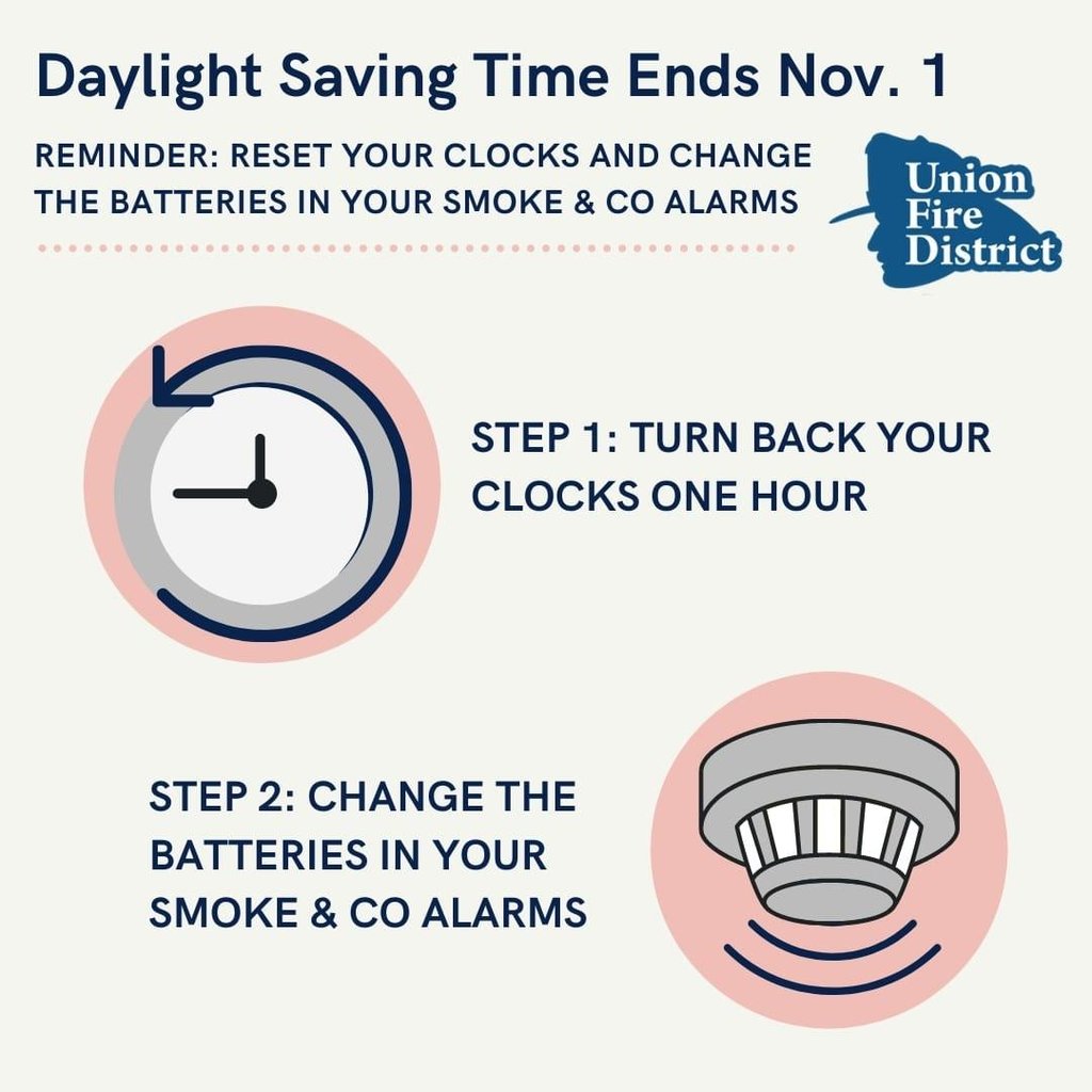 The Union Fire District also asks that all business owners not only change their clocks, but also change the batteries in their smoke and carbon monoxide alarms, and replace the batteries on wall mounted emergency lights and exit signs. All businesses should have emergency backup lighting as a safety feature to provide temporary lighting in case of power failure.