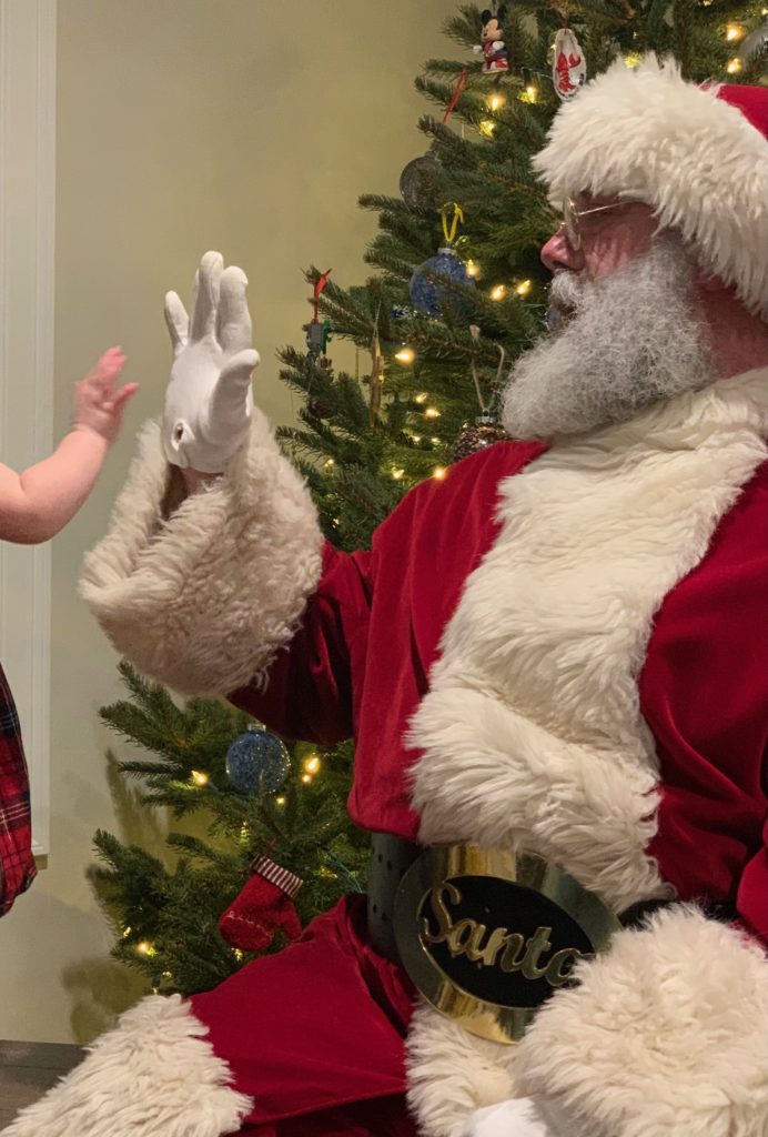 Picture of Santa Claus high-fiving a Merrimac resident from a previous year. (Photo courtesy Merrimac Fire Department)