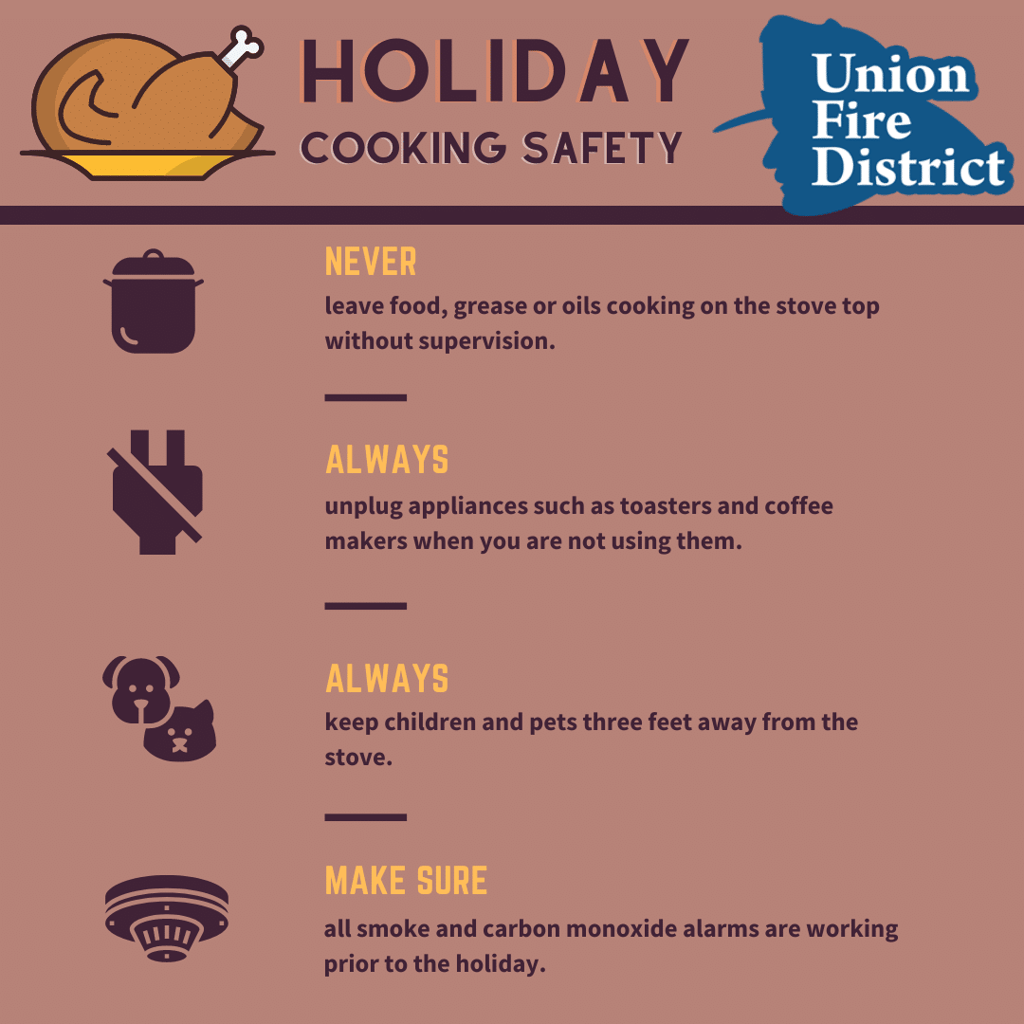To prevent any seasonal cooking home fires, the Union Fire District wishes to share the following tips from the NFPA so families can prepare holiday meals without the risk of tragedy:
