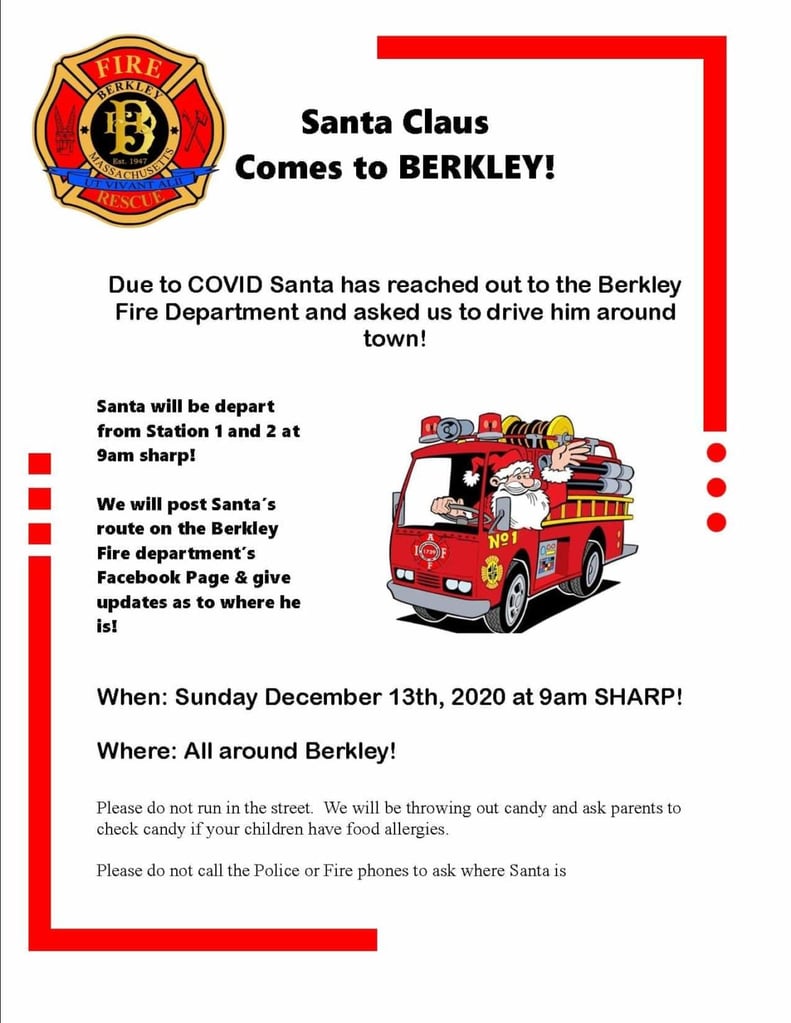 Santa Claus will be joining Berkley Firefighters this weekend to spread some holiday cheer around the Town of Berkley. During his visit, Santa will ride in a Berkley fire truck while waving and tossing candy out to residents.