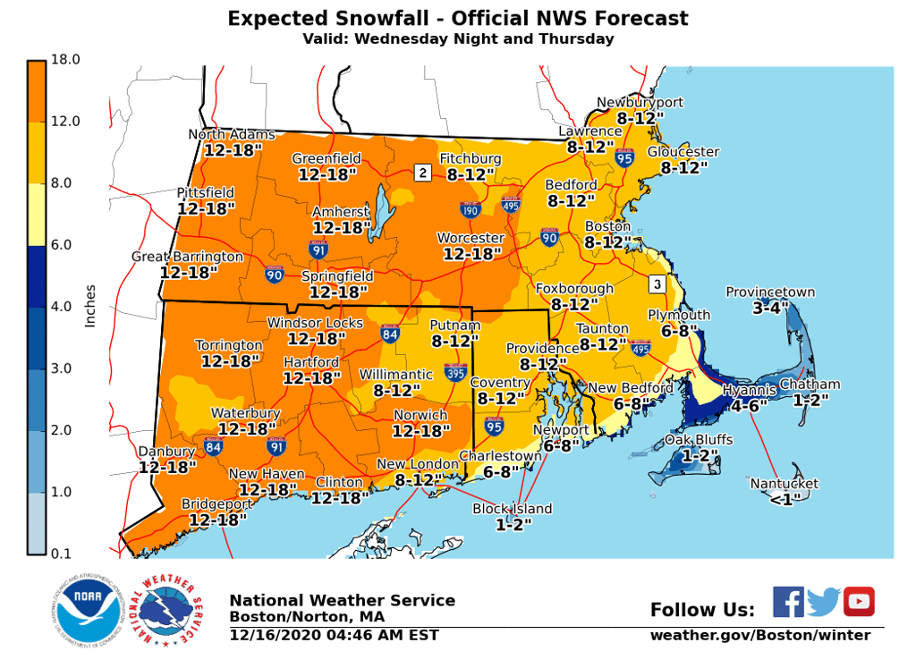 The National Weather Service (NWS) is predicting hazardous weather conditions with current snow accumulations forecast to be six to 11 inches overnight into Thursday, Dec 17. In addition, the area is under a Winter Storm Warning from 7 p.m. Wednesday until 1 p.m. Thursday. Gusty winds and isolated power outages are possible, as well as freezing roads. According to the NWS, travel may be very difficult to impossible.