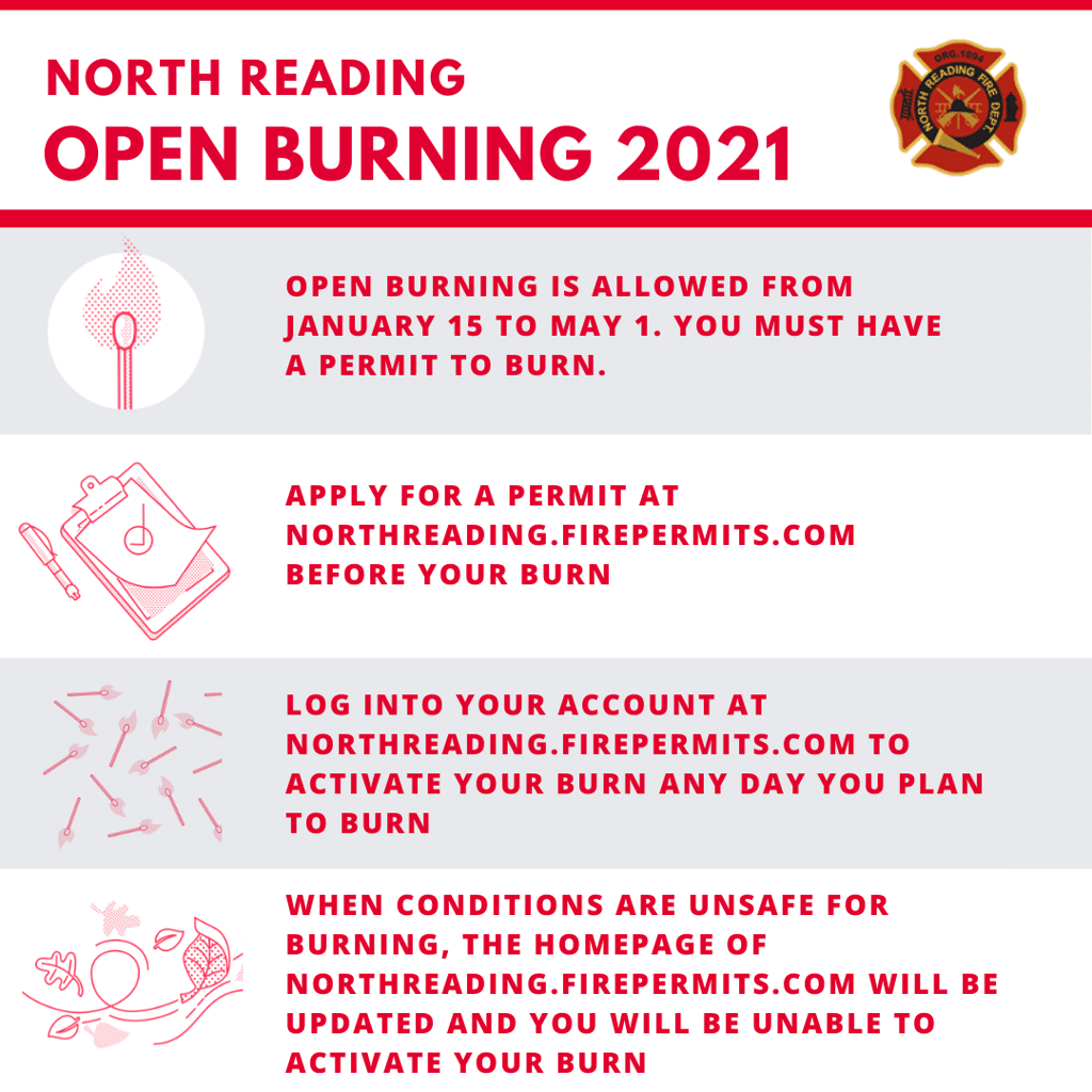 NORTH READING — Chief Don Stats and the North Reading Fire Department wish to remind residents that open burning will begin on Friday, Jan. 15, 2021, and that a burn permit is required to be in compliance with Massachusetts law.