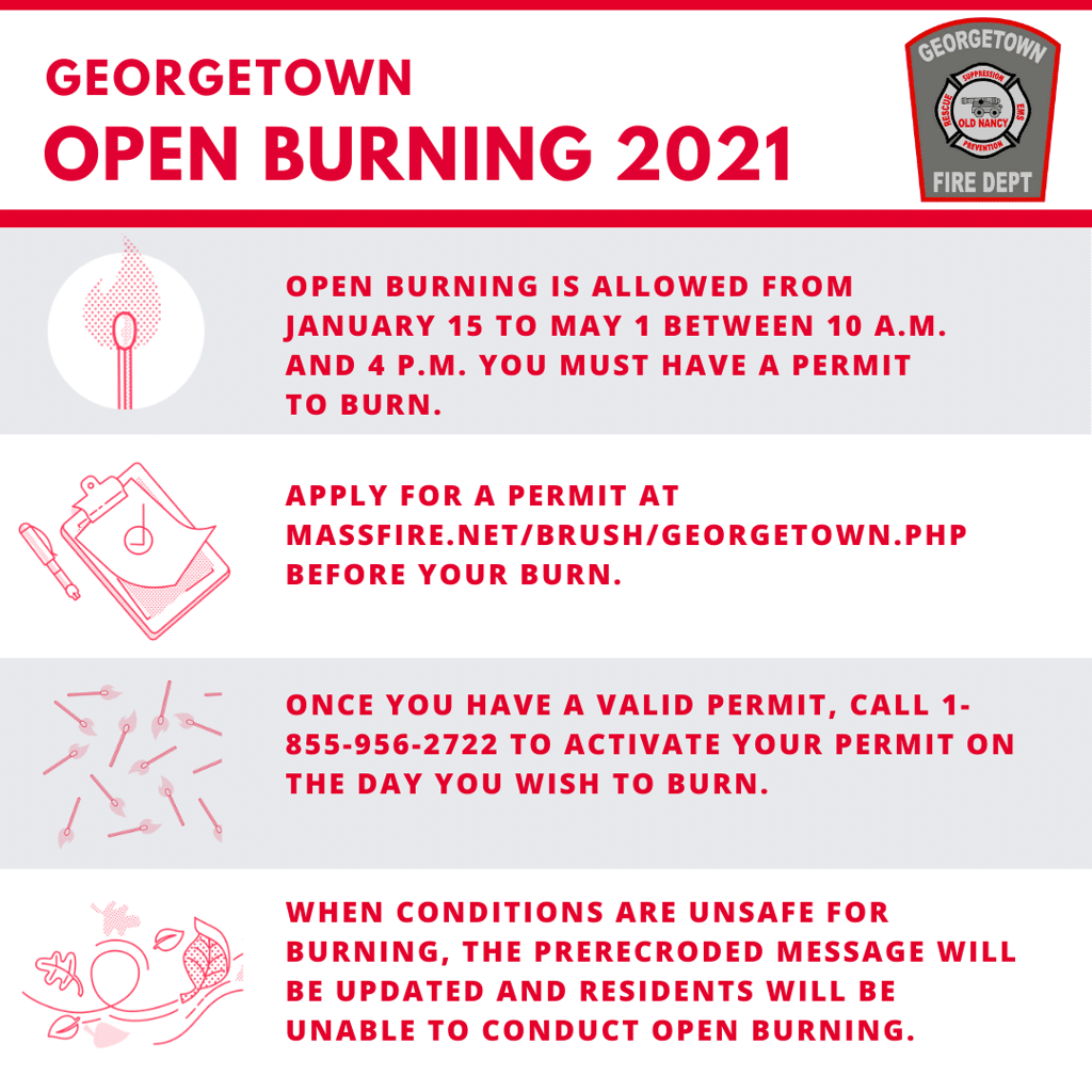 Anyone with questions regarding opening burning should call the Georgetown Fire Department at 978-352-5757.