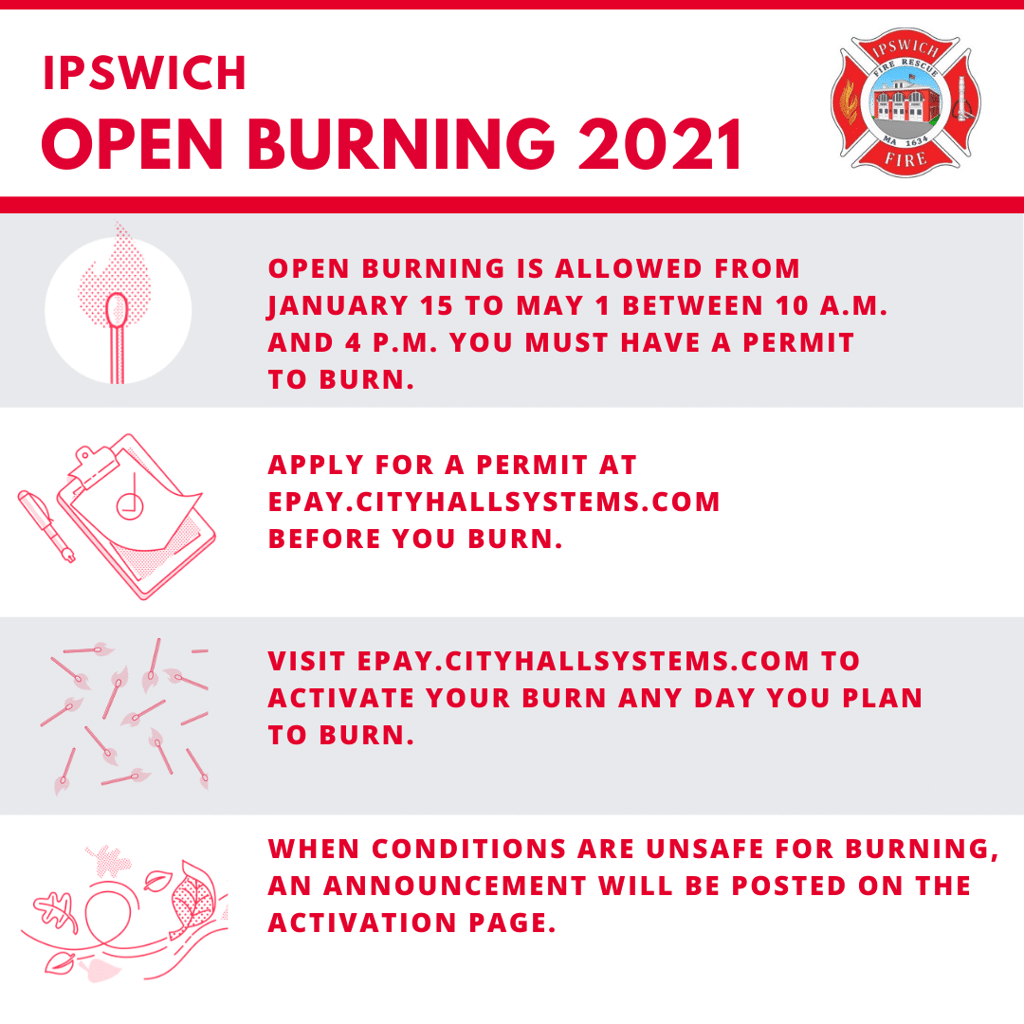 Anyone with questions regarding opening burning should call the Ipswich Fire Department at 978-356-4321.