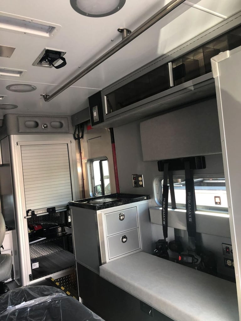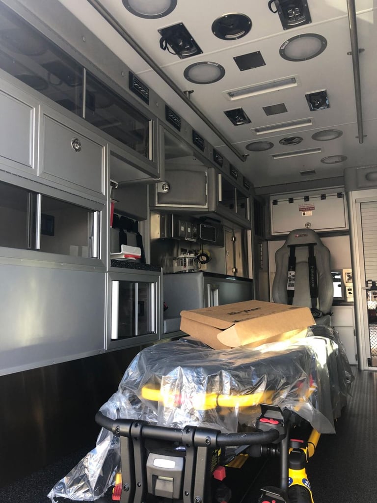 The new ambulance features a Stryker power loading system that improves operator and patient safety by supporting the cot throughout the loading and unloading process. The new ambulance is also equipped with a Lucas Chest Compression Device and a LifePak 12 cardiac monitor. The ambulance also features built-in UV disinfecting lights and a positive/negative pressure work area.