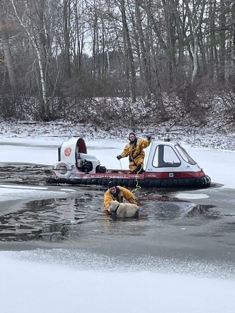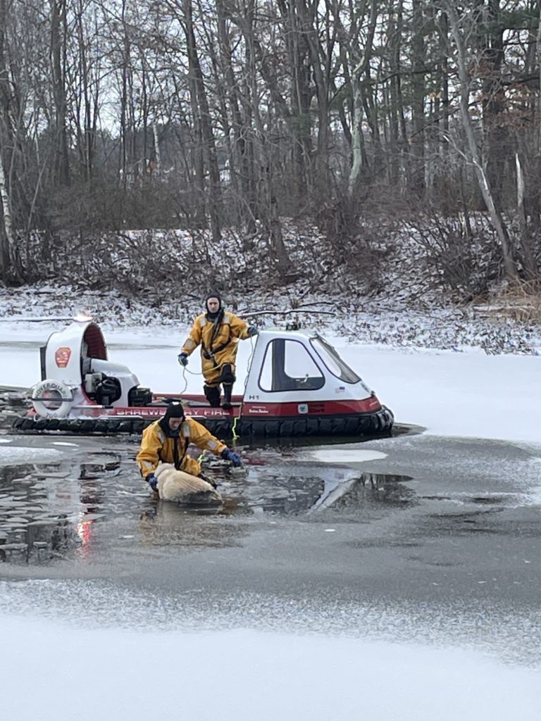 Shortly after 9:20 a.m., Shrewsbury Fire was dispatched to Flint Pond for a report of a dog that had fallen through the ice. A firefighter in a rescue suit with a line attached first attempted to help the dog, Rocky, but was unable to due to the amount of sand and silt at the bottom of the pond. Two firefighters then used the department’s hovercraft to get closer to the dog. One firefighter was able to reach the dog and bring it back to the hovercraft.