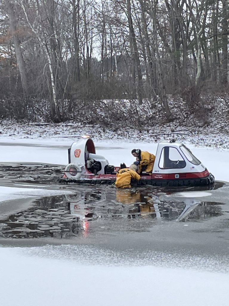 “The owner did the right thing by calling us to rescue the dog rather than trying to rescue the dog themselves,” Chief James Vuona said. “During the winter months, temperatures can fluctuate and cause the ice to weaken, so it’s important that residents do not attempt to walk out on any, regardless of the depth of water. Thank you to everyone involved with today’s rescue and for their skilled, thoughtful work to safely reunite the dog and the owner. This incident showed how critically important the Hovercraft is during the winter months when the ice is very thin. I credit our firefighters for continually training with the equipment and on Ice and Water Rescue Techniques”