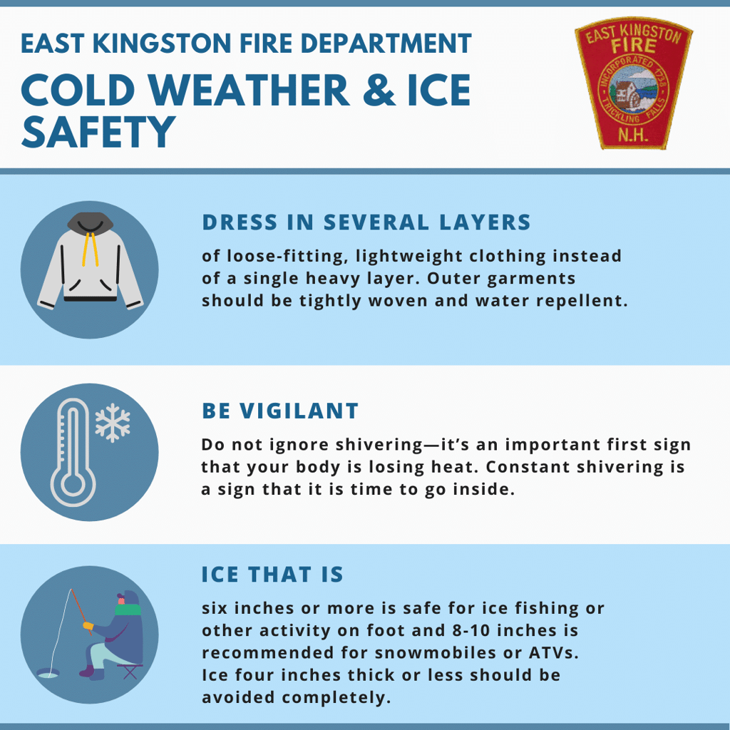 EAST KINGSTON, N.H. — Chief Ed Warren and the East Kingston Fire Department wish to remind residents to always be aware of the dangers of thin ice and to share tips for remaining safe on the ice.