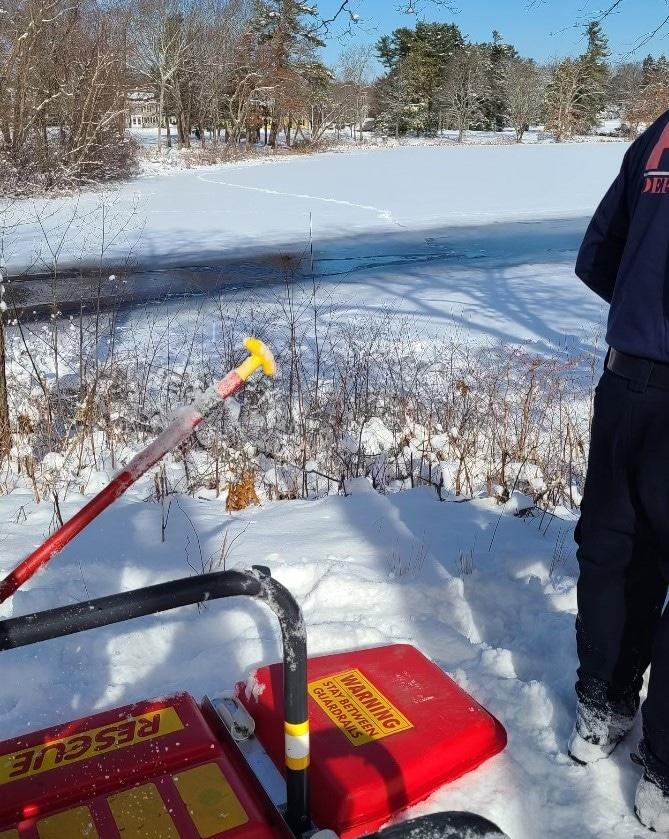 At approximately 10:35 a.m., Easton Fire received a call from a person who was passing by Shovelshop Pond, on Pond Street, who reported that they saw a dog on the ice and that the dog had fallen through the ice into the water.