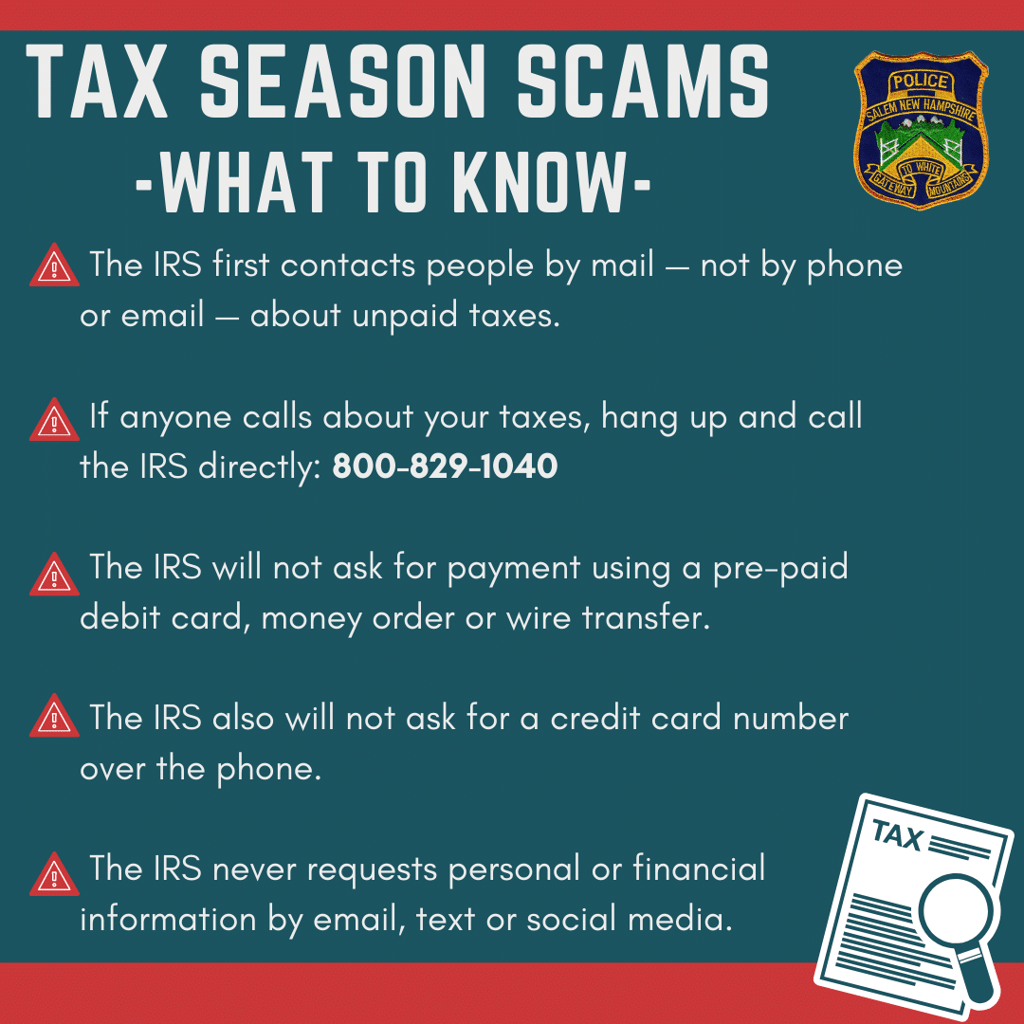 SALEM, New Hampshire — With tax deadlines approaching, Chief Joel Dolan and the Salem Police Department would like to advise the community to be careful with personal and financial information when filing.