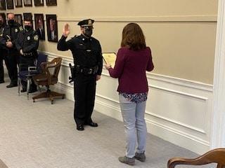 Sgt. MacIntosh was promoted and sworn in by City Clerk Amy Kamosa during a socially distanced ceremony at City Hall on Monday, March 1.