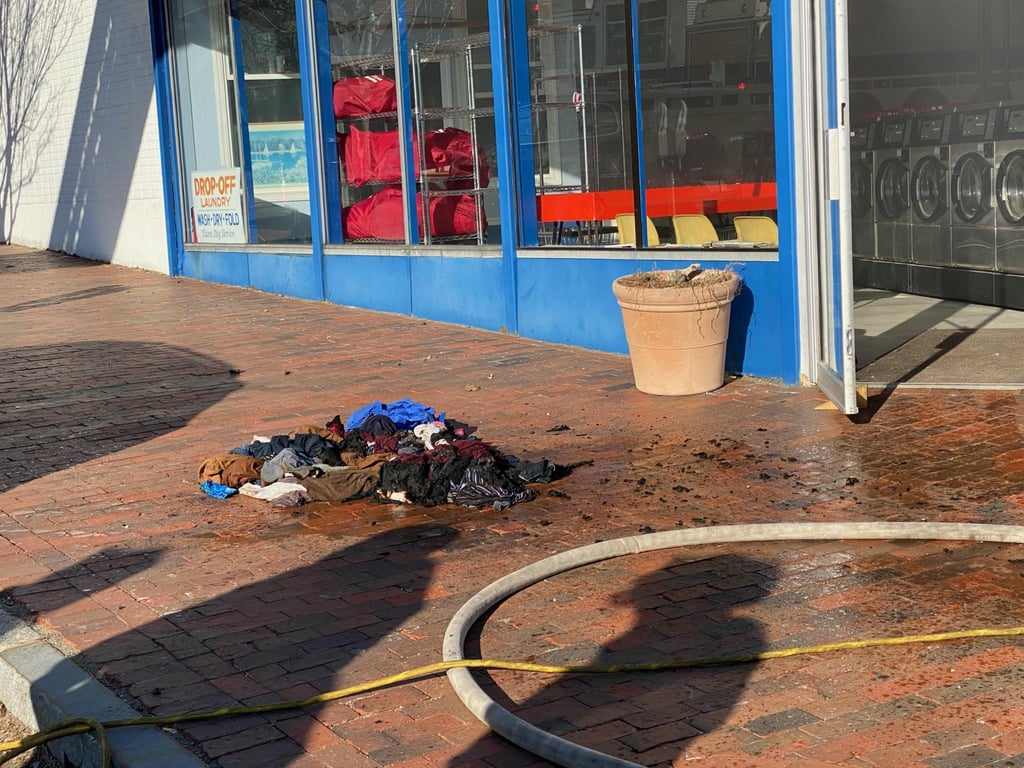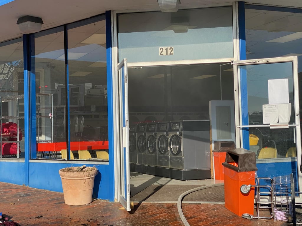 A resident who was inside the garage at the time of the fire was treated on-scene for first-degree burns, which he suffered while trying to extinguish the fire himself. There were no injuries at the laundromat.