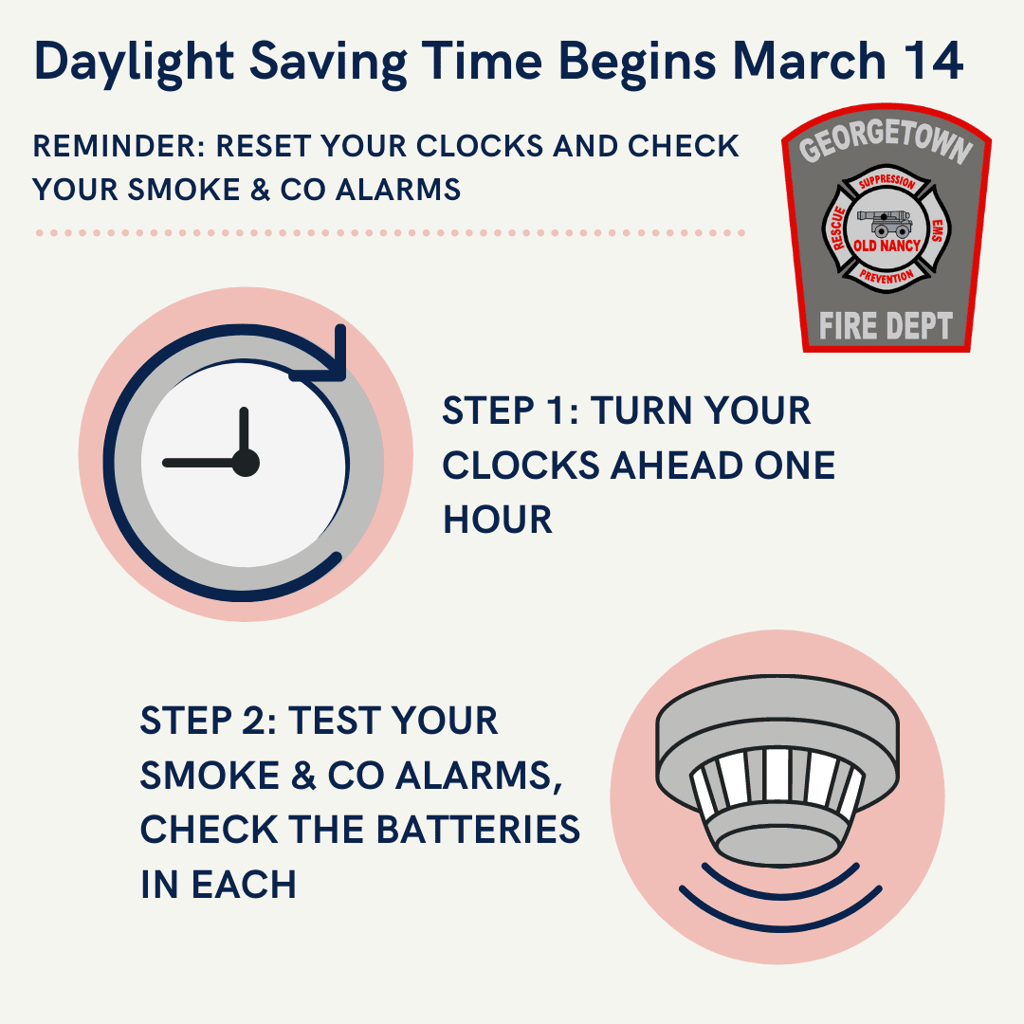 GEORGETOWN — Chief Fred A. Mitchell Jr. and the Georgetown Fire Department Fire Department wish to remind residents to test their smoke and carbon monoxide alarms and check the batteries in each when they move their clocks ahead to start daylight saving time Sunday.