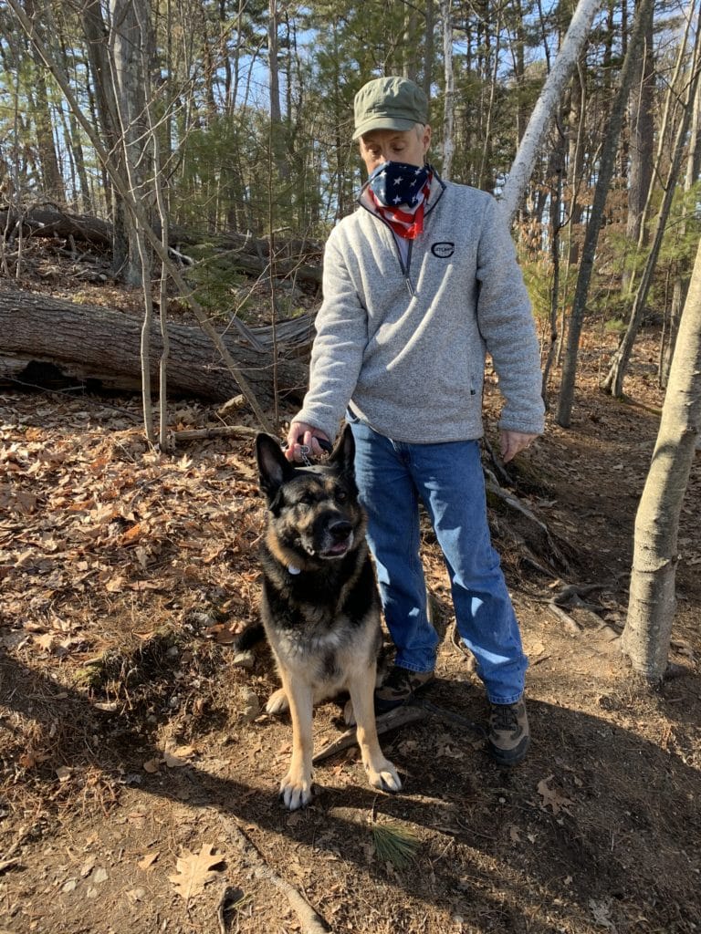 One of the men, Thomas Walsh, was walking in the area with his five-year-old German Shepherd, Diesel, when his dog heard the man in the water calling for help and alerted his owner. Walsh was able to help direct the man to crawl on the ice towards the shore until he and another man walking in the area were able to help pull him to shore with a branch.