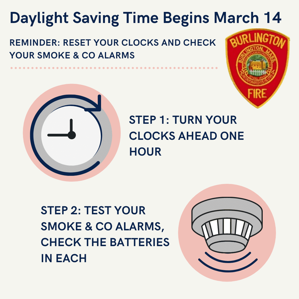 BURLINGTON — Chief Michael Patterson and the Burlington Fire Department wish to remind residents to test their smoke and carbon monoxide alarms and check the batteries in each when they move their clocks ahead to start daylight saving time Sunday.