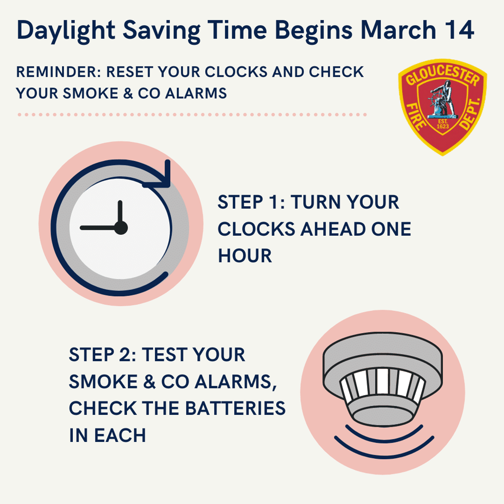 GLOUCESTER — Chief Eric Smith and the Gloucester Fire Department wish to remind residents to test their smoke and carbon monoxide alarms and check the batteries in each when they move their clocks ahead to start daylight saving time Sunday.