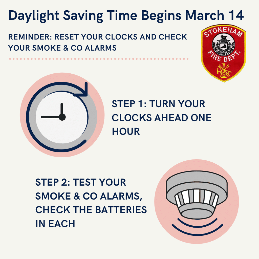 STONEHAM — Chief Matthew Grafton and the Stoneham Fire Department wish to remind residents to test their smoke and carbon monoxide alarms and check the batteries in each when they move their clocks ahead to start daylight saving time Sunday.