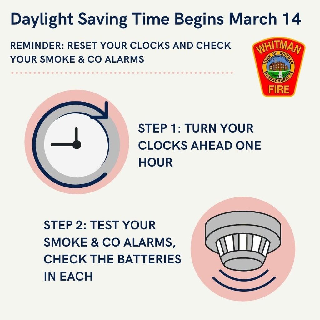 WHITMAN — Chief Timothy Grenno and the Whitman Fire Department wish to remind residents to test their smoke and carbon monoxide alarms and check the batteries in each when they move their clocks ahead to start daylight saving time Sunday.