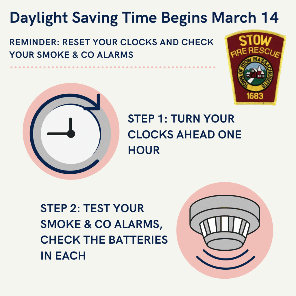 STOW — Chief Joseph Landry and the Stow Fire Department wish to remind residents to test their smoke and carbon monoxide alarms and check the batteries in each when they move their clocks ahead to start daylight saving time Sunday.