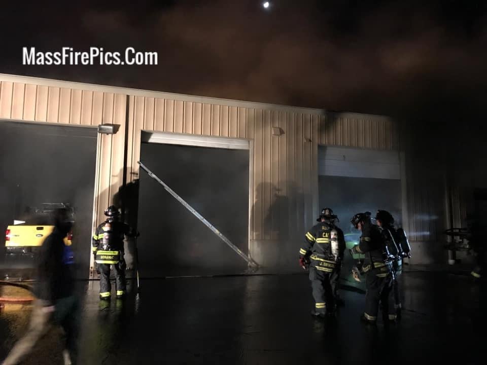 Several sprinkler heads had activated which held the fire in check until fire crews arrived. Upon entering the building through a side door, firefighters found the fire to be coming from a vehicle inside a rear bay. After extinguishing the bulk of the fire, visibility conditions inside deteriorated as heavy smoke filled the complex.